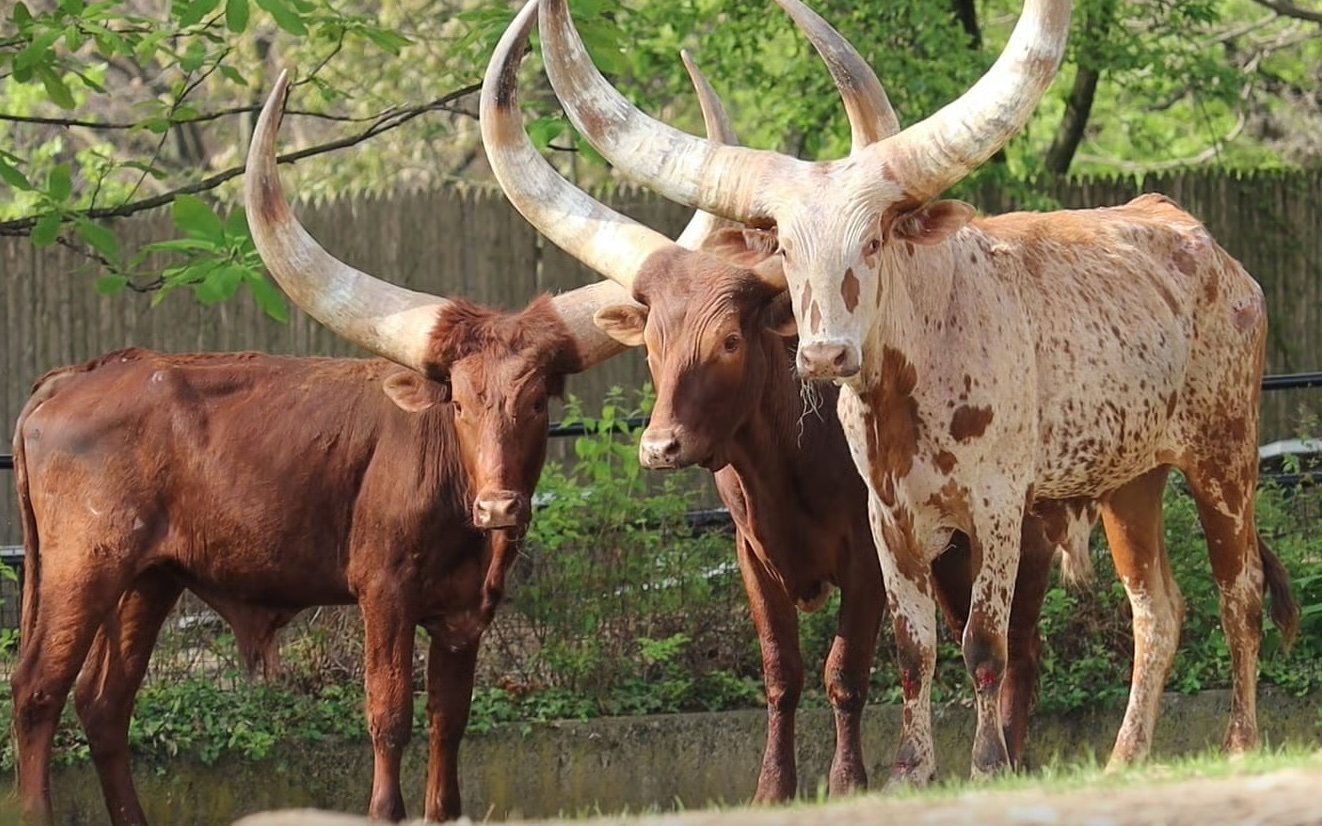 The Watusi cattle are named after the Tutsi tribe of Rwanda. Watusi are rarely killed for their meat. A dominant male, females and young Watusi, live together as a family group. Their lifespan is 12 to 20 years, and up to 26 years in captivity.